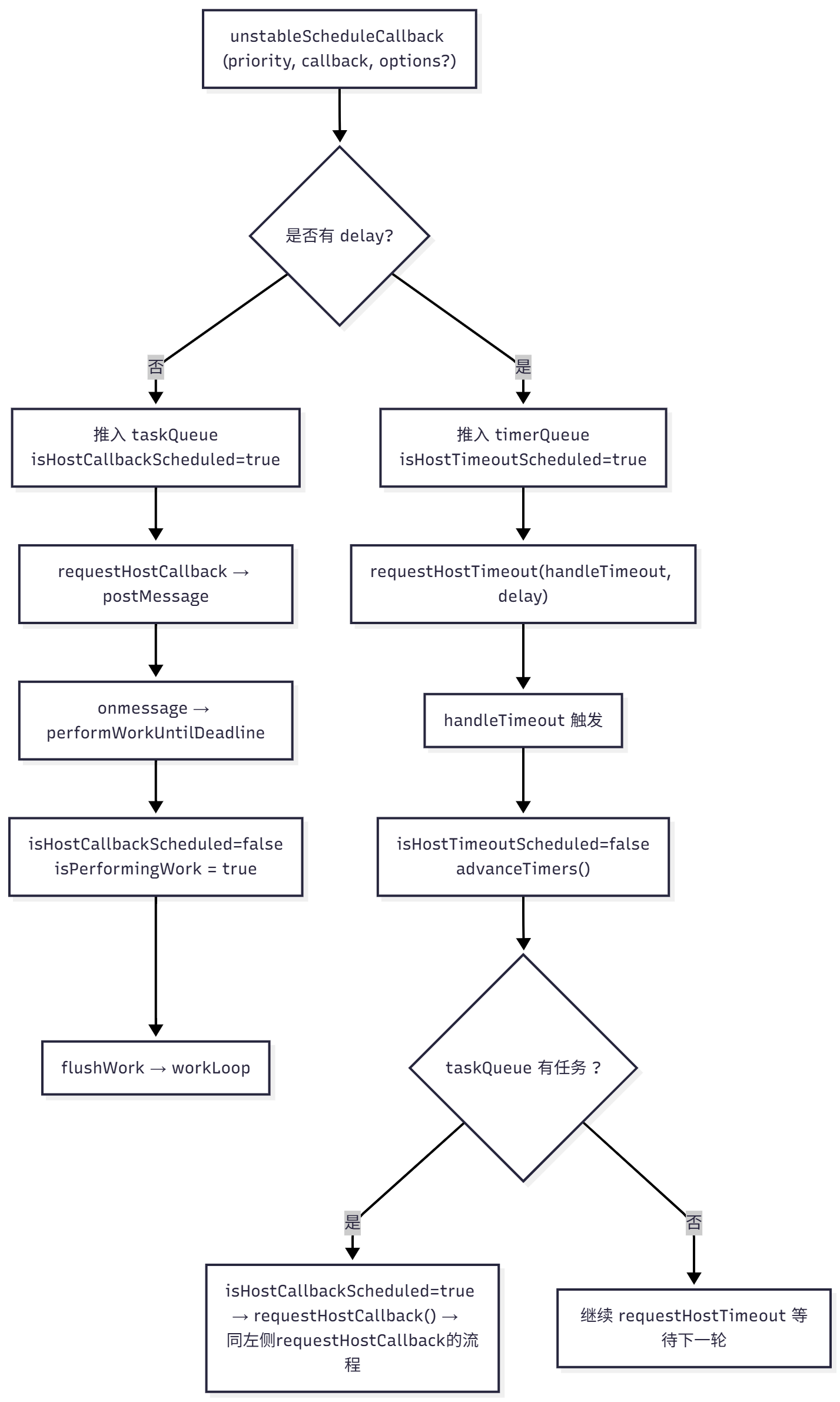 另一种可能就是,taskQueue里的所有任务都已经被执行完了,那么就该去看看timerQueue了,里面是还没到开始时间的任务。如果timerQueue里面有任务,那么就通过requestHostTimeout(handleTimeout, firstTimer.startTime - currentTime);这一句去调度它。具体的逻辑,我们将在下一部分介绍。