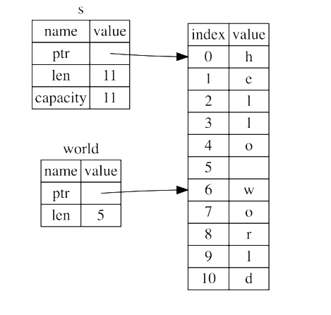 let world = &s[6..11];特殊索引:省略左边便是从0开始,省略右边表示直到最后。两侧全省略,即